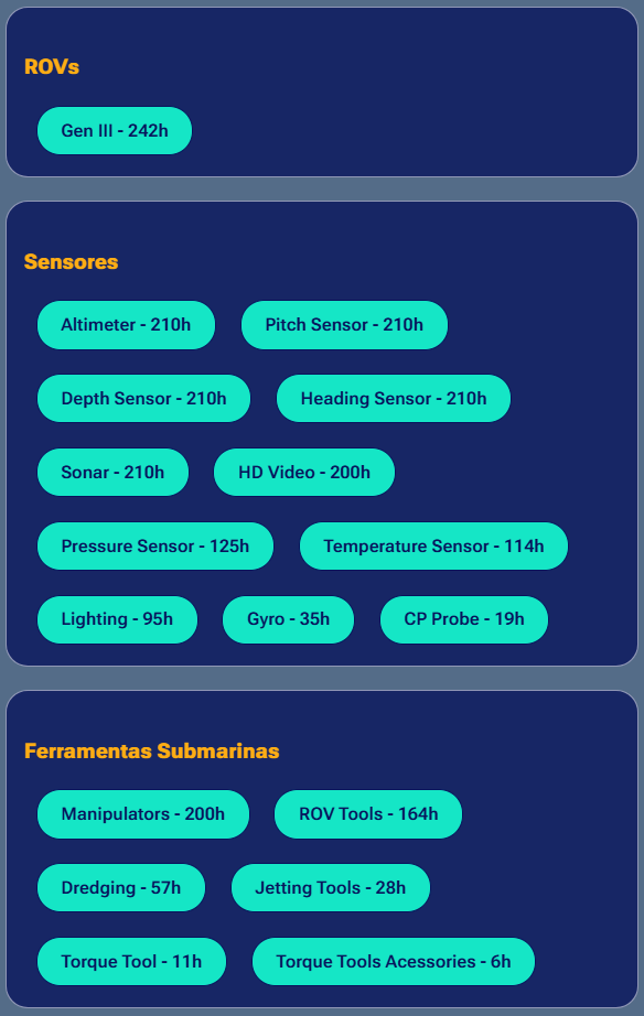 Acompanhe sua evolução profissional com uma visão ainda mais completa e detalhada das horas registradas em cada tipo de ROV, sensor e ferramenta utilizada ao longo das suas operações. Além de centralizar todo seu histórico técnico, essa seção oferece uma leitura aprofundada da sua experiência prática, facilitando a compreensão do seu domínio em diferentes equipamentos e tecnologias.