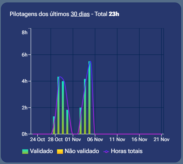 Visualize sua evolução em gráficos inteligentes e totalmente intuitivos. Acompanhe, em detalhes, como suas horas de voo se acumulam ao longo dos dias, semanas e meses, identifique os tipos de missão que você mais executa, descubra seus períodos de maior produtividade e também aqueles momentos em que a atividade diminui. Tudo isso apresentado de forma clara, organizada e simples de interpretar, permitindo que qualquer piloto compreenda rapidamente seus próprios padrões de desempenho e ritmo de trabalho.